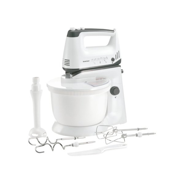 Com suporte, pode ser usado como um liquidificador Copo giratório removível com acionamento automático Pode ser usado como um liquidificador 5 níveis de velocidade e função turbo Tampa protetora com orifício de enchimento que pode ser fechado O liquidificador também pode ser usado sem suporte Acessórios: 2 batedores e 2 ganchos de mistura de aço inoxidável, 1 acessório para purê com faca de aço inoxidável, 1 espátula de massa de plástico Volume útil (tigela): aprox. 2,5 l Espátula de massa, tigela, tampa, batedores e ganchos de mistura laváveis Conjunto de 10 peças Dados técnicos Desempenho: 300 W Material Aço inoxidável, plástico. Potência: 300 W.