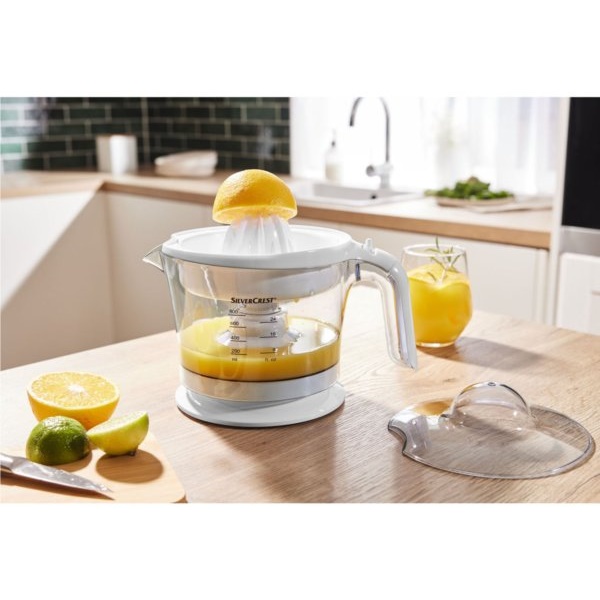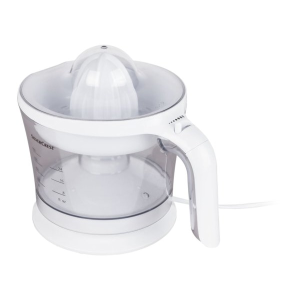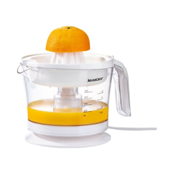 Para a preparação de sumos de frutas frescas Rotação esquerda/direita para um sumo ideal 2 cones de pressão para diferentes tamanhos de fruta (por exemplo, laranjas, toranjas ou limões) Ligar/desligar automático pressionando o cone de pressão Acessório de peneira com regulador para proporção ajustável de polpa e para pegar núcleos Recipiente removível para suco Limpeza simples, todas as partes removíveis são adequadas para a máquina de lavar louça* Com enrolador de cabo Volume utilizável: 800 ml Dados técnicos Potência: 25 W Dimensões aprox. 17,6 x 25,7 x 19,6 cm Comprimento do cabo: aprox. 117 cm Peso aproximadamente 832 g. Consumo de energia: 25 W.