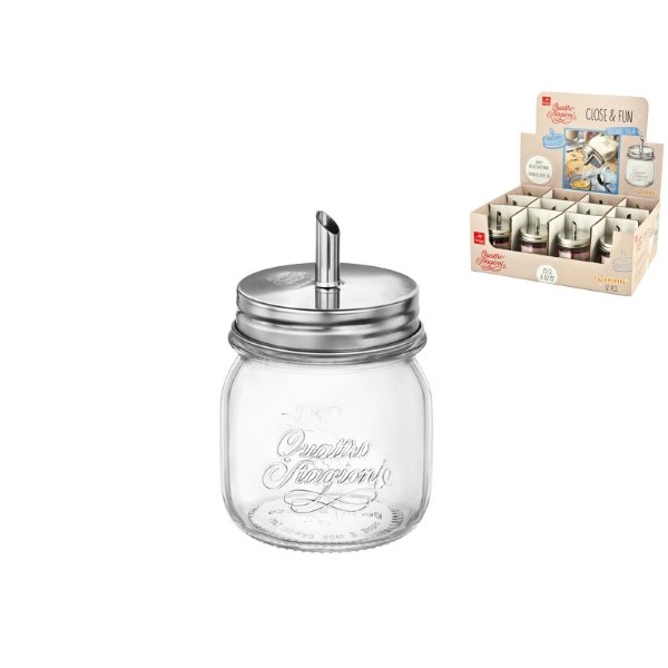Pote de vidro com tampa metálica, rosca, bico dosador.